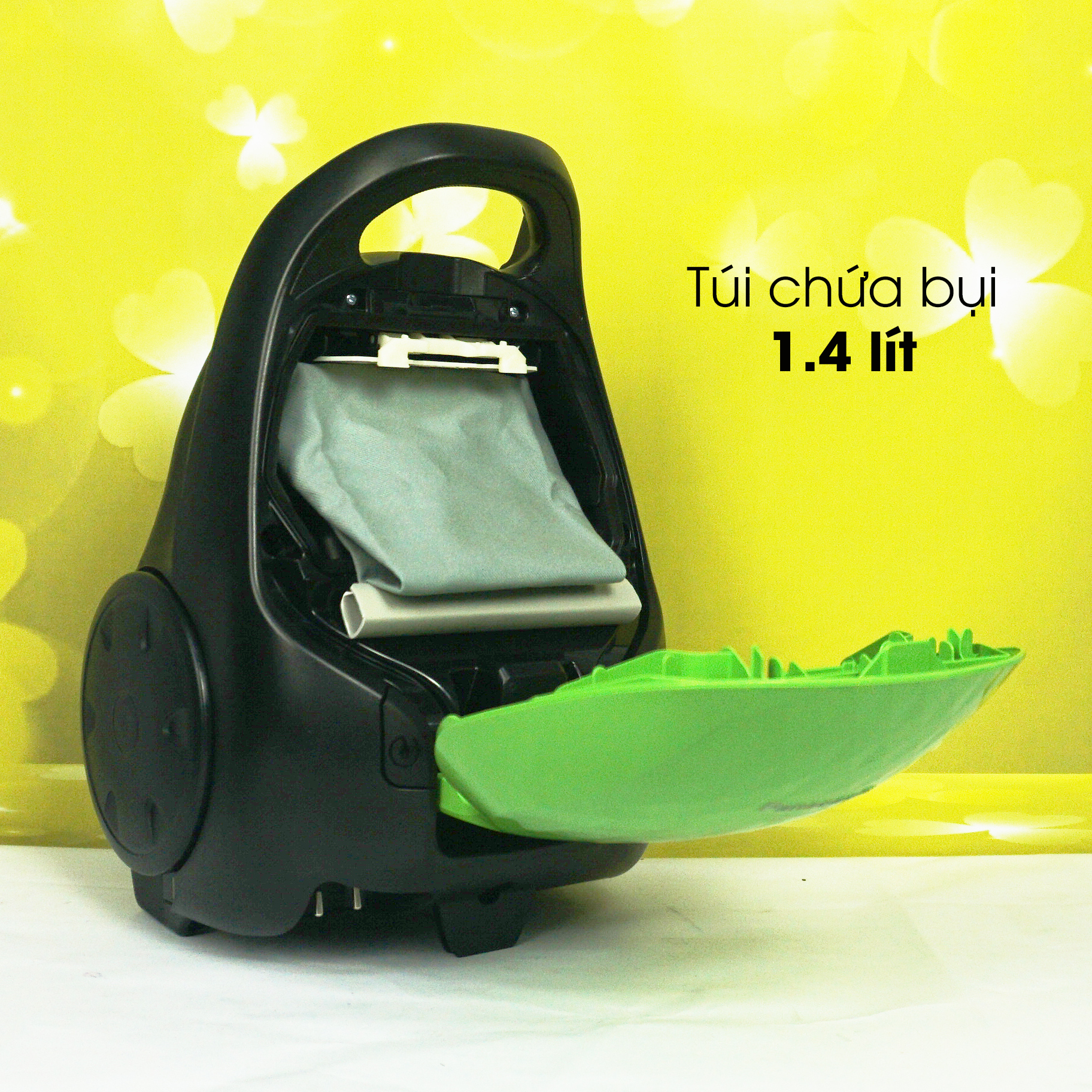 Máy hút bụi sử dụng túi chứa bụi dung tích lớn đến 1.4 lít, giúp kéo dài thời gian hút bụi mà không phải đổ bỏ, thay thế túi chứa bụi nhiều lần