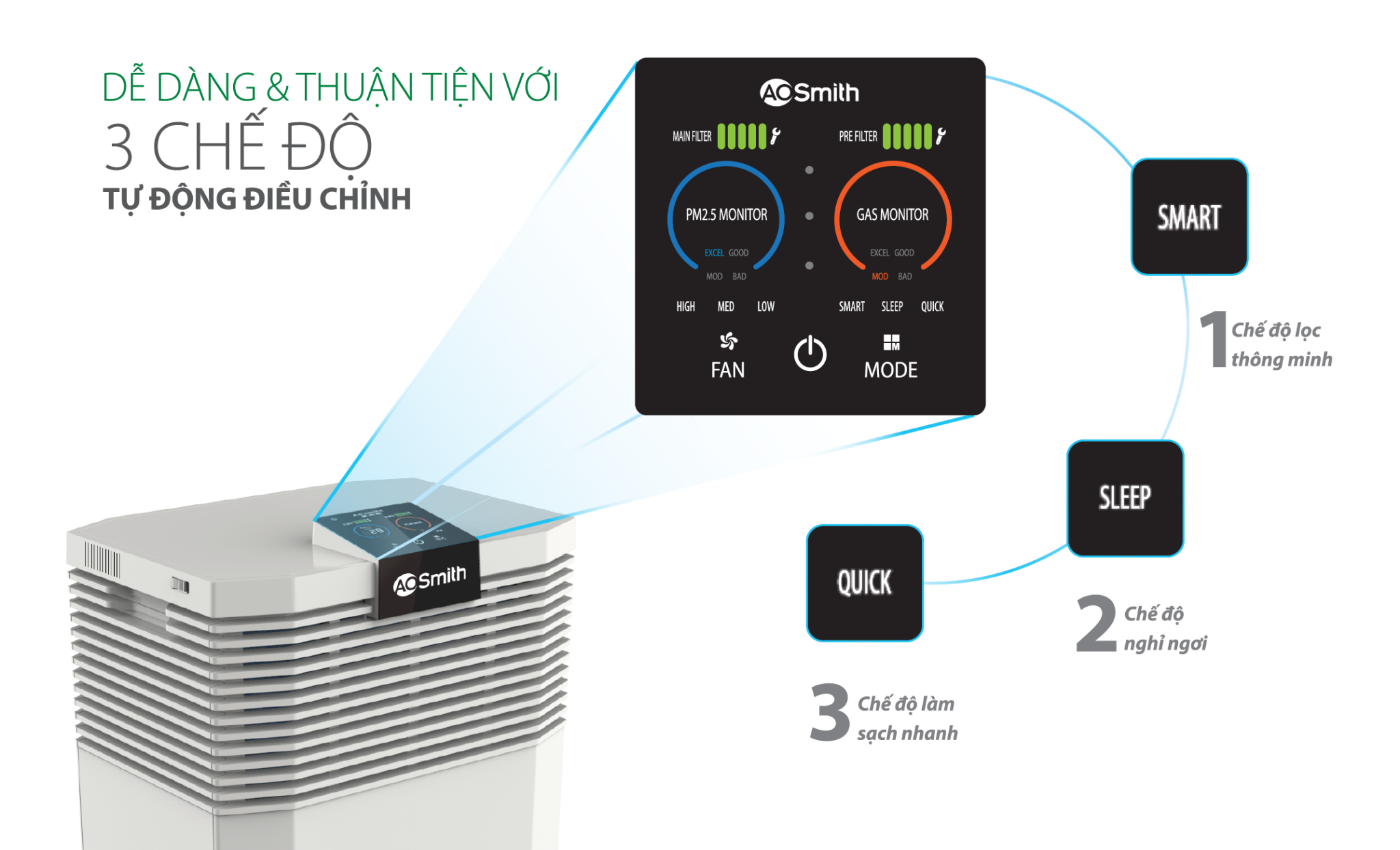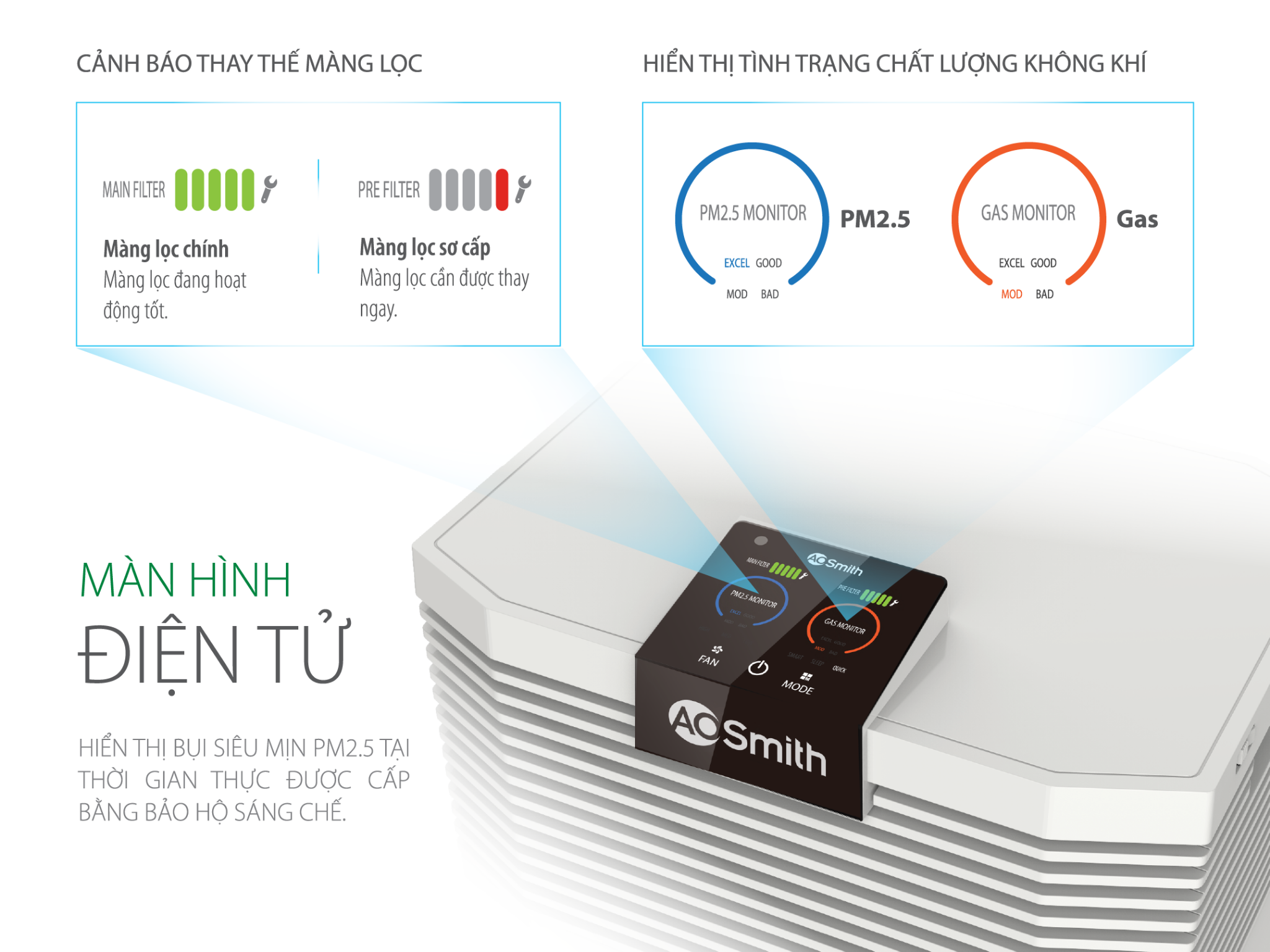 - Máy lọc không khí A. O. Smith sở hữu màng lọc chuyên dụng và những tính năng tiện nghi nhất, giúp loại bỏ hiệu quả các chất gây ô nhiễm không khí, để bạn an tâm tận hưởng nguồn không khí thật sự trong lành.