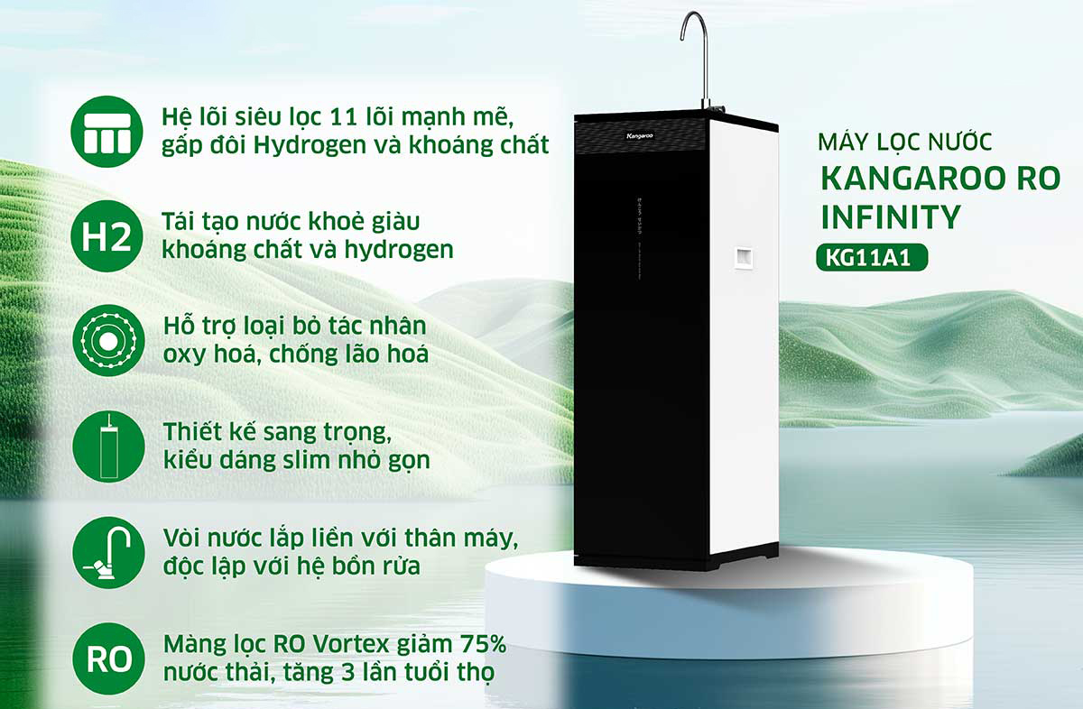Sử dụng hệ thống 11 lõi lọc giúp Máy lọc nước Kangaroo KG11A1 không những lọc sạch vi khuẩn, tạp chất mà còn bổ sung khoáng chất tự nhiên có lợi cho cơ thể. Công suất lọc lớn 18L/h đáp ứng mọi nhu cầu sử dụng của gia đình đông người.