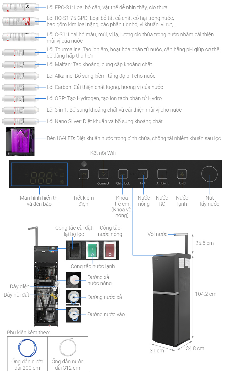 | Dung tích bình chứa | Tổng 5.8 lít (Nước nóng 1 lít, nước lạnh 1.8 lít, nước thường 3 lít) |