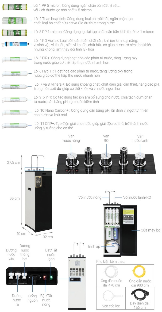 | Dung tích bình chứa | RO: 7L – Nóng: 0.8L – Lạnh: 0.8L |