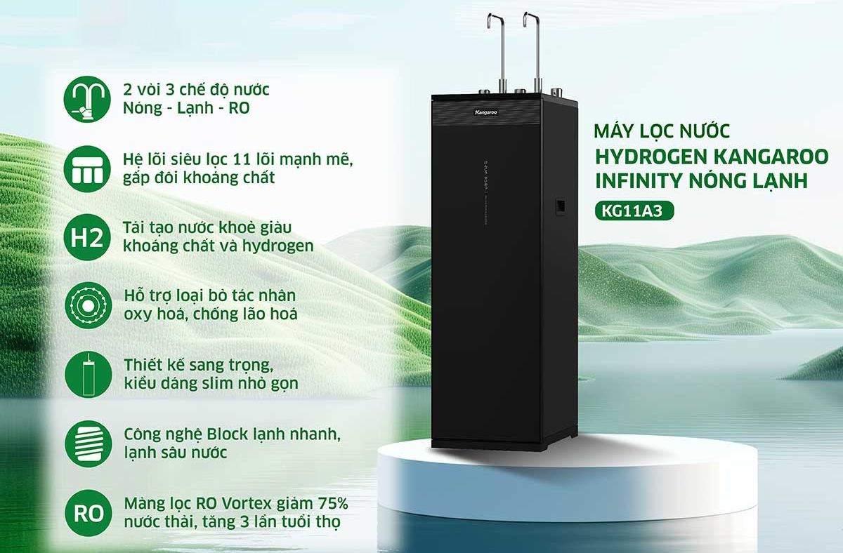 Sử dụng hệ thống 11 lõi lọc giúp Máy lọc nước Kangaroo Hydrogen KG11A3 không những lọc sạch vi khuẩn, tạp chất mà còn bổ sung khoáng chất tự nhiên có lợi cho cơ thể. Công suất lọc lớn 18L/h đáp ứng mọi nhu cầu sử dụng của gia đình đông người.