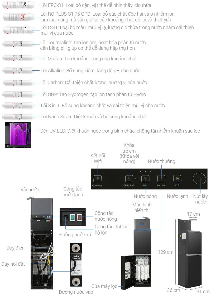 | Dung tích bình chứa | Tổng 4.8 lít (Nước nóng lọc trực tiếp, nước lạnh 1.8 lít, nước thường 3 lít) |