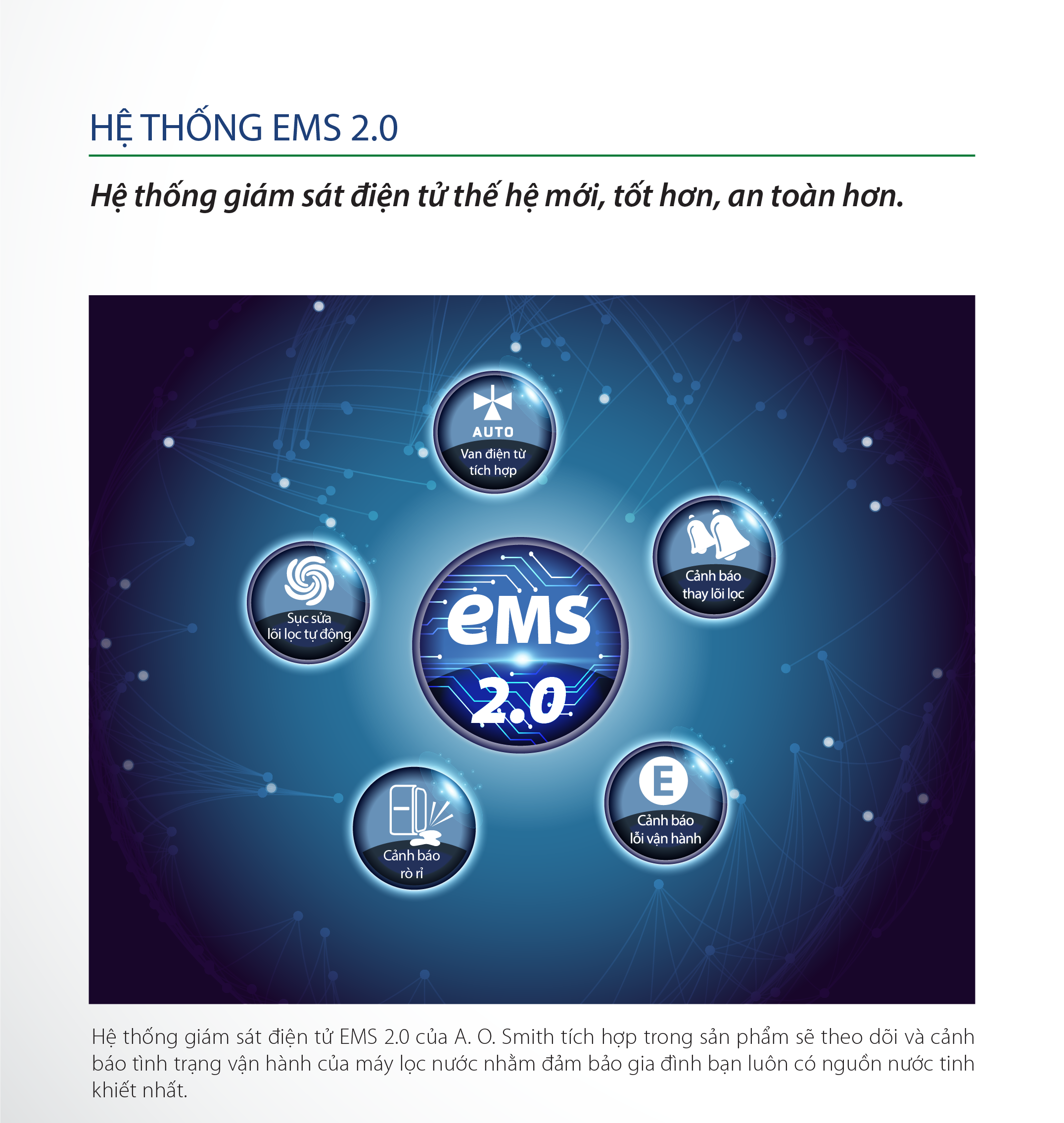 Hệ thống giám sát điện tử EMS 2.0 thế hệ mới của A. O. Smith tích hợp trong sản phẩm giúp đồng bộ hoạt động của các bộ phận, theo dõi và cảnh báo tình trạng vận hành của máy. Hệ thống bao gồm các chức năng:
