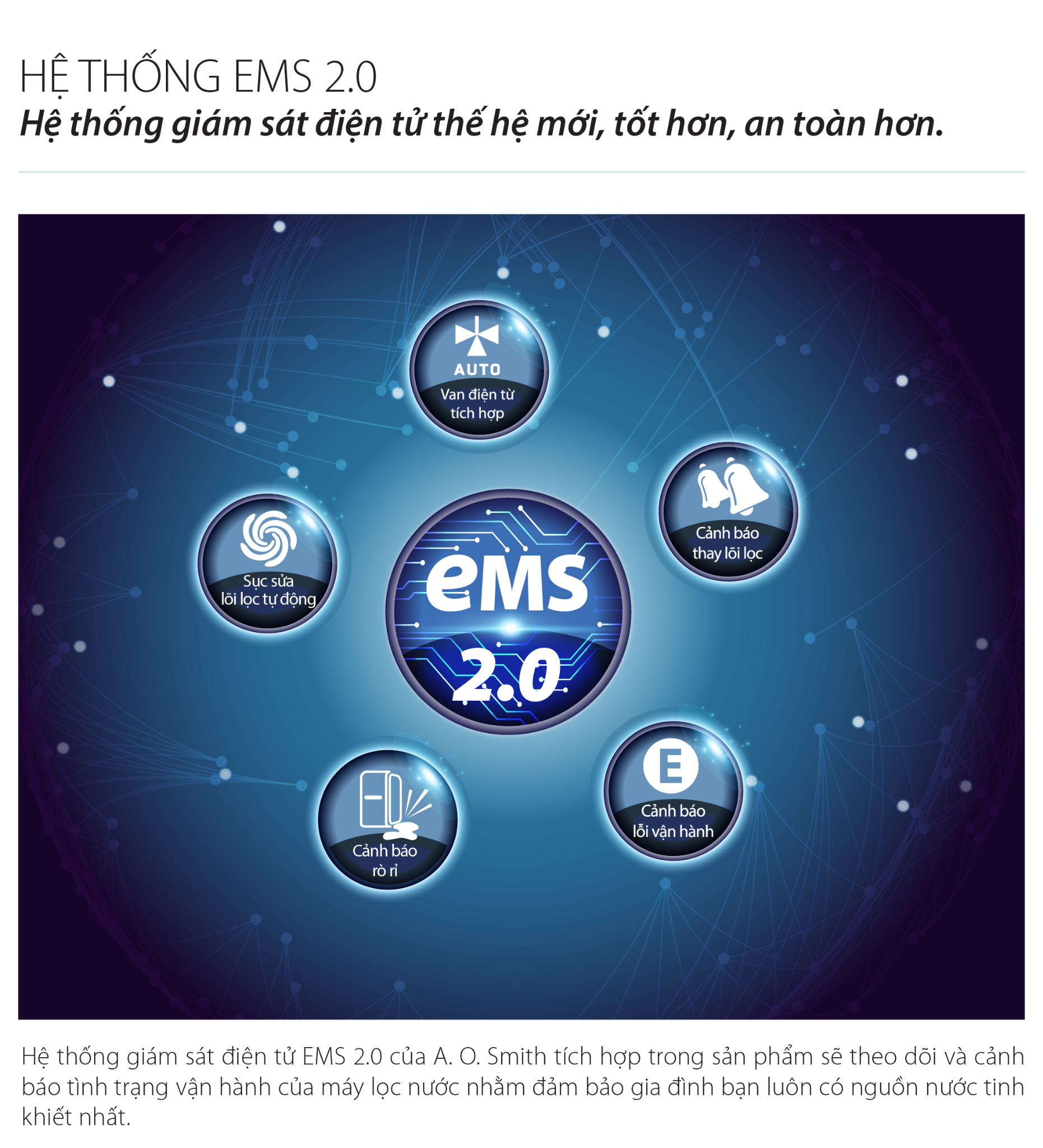 Hệ thống giám sát điện tử EMS của A. O. Smith tích hợp trong sản phẩm sẽ theo dõi và cảnh báo tình trạng vận hành của máy lọc nước nhằm đảm bảo gia đình bạn có nguồn nước tinh khiết nhất. Hệ thống bao gồm các chức năng: