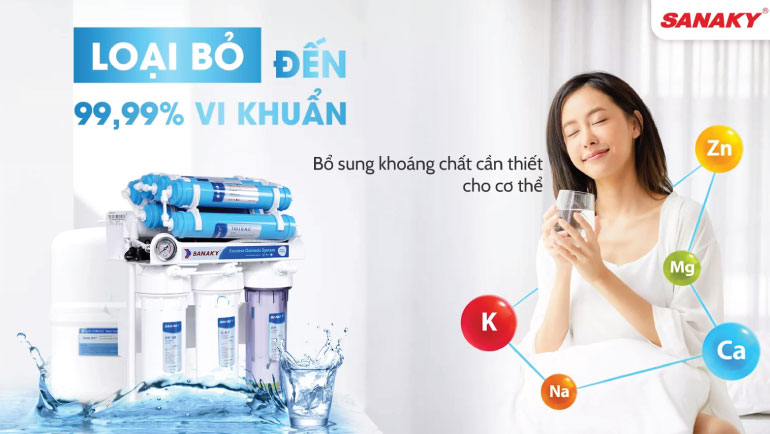 Loại bỏ đến 99.99% vi khuẩn, các tạp chất vô cơ, hữu cơ như chlorine, thuốc trừ sâu, kim loại nặng, … và các chất khác gây ảnh hưởng không tốt tới sức khỏe của gia đình bạn. Nước đầu ra được kiểm định theo tiêu chuẩn nước uống trực tiếp QCVN 6-01:2010 của Bộ Y tế. Màng lọc thấm ngược (RO) tạo ra nguồn nước tinh khiết, sạch khuẩn, bảo vệ sức khỏe gia đình bạn. Lõi Nano Bạc chức năng diệt vi khuẩn và chống tái nhiễm khuẩn đảm bảo chất lượng nước uống trực tiếp. Lõi Hydrogen OPH+ bổ sunng chất điện giải, làm giảm mệt mỏi căng thẳng cho cơ thể.