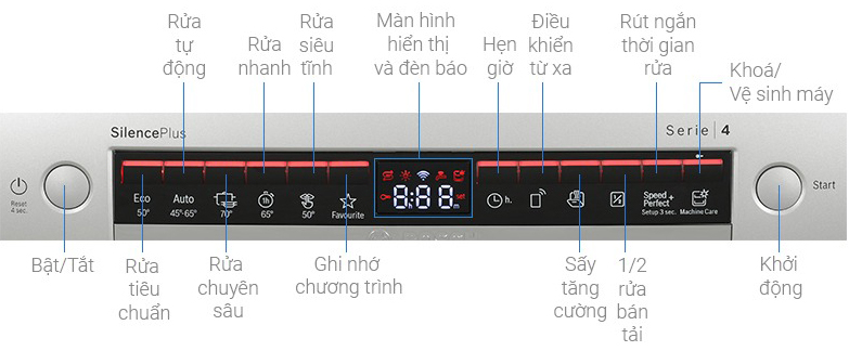 - Chức năng vệ sinh máy Machine care: Loại bỏ vết thức ăn, vết bụi bẩn, mùi hôi và hạn chế vi khuẩn phát triển bên trong khoang rửa, từ đó nâng cao hiệu quả rửa chén bát và duy trì độ bền máy tốt hơn.