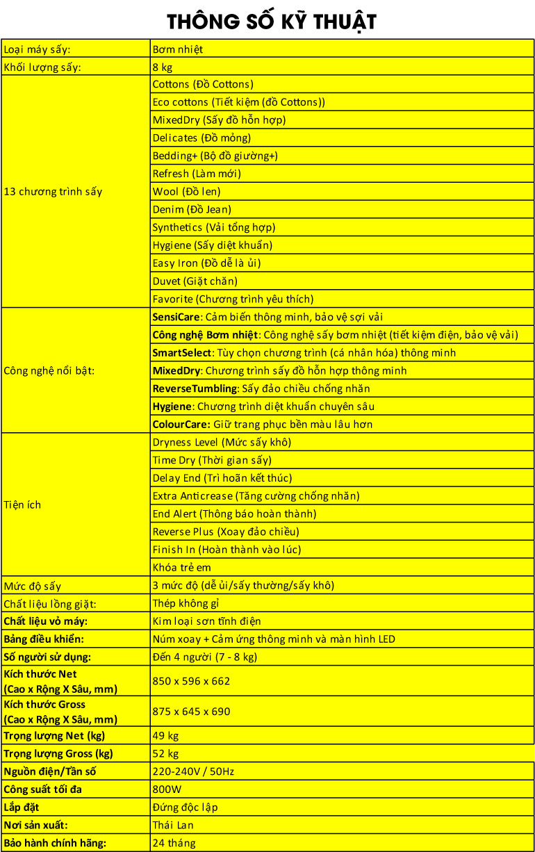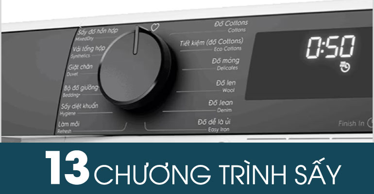 Máy sấy được trang bị 13 chương trình sấy khác nhau, từ sấy nhanh, sấy đồ len, đồ thể thao đến sấy nhẹ cho các loại vải mỏng manh. Bạn có thể dễ dàng chọn lựa chương trình phù hợp với từng loại vải, đảm bảo quần áo được sấy khô hoàn hảo mà không làm hư hại chất liệu.