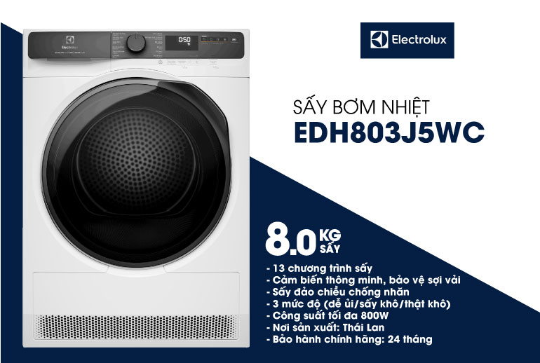 Máy sấy bơm nhiệt Electrolux EDH803J5WC không chỉ mang đến khả năng sấy khô nhanh chóng, hiệu quả mà còn bảo vệ trang phục tối ưu. Với những tính năng hiện đại, sản phẩm này là trợ thủ đắc lực cho mọi gia đình, giúp bạn tiết kiệm thời gian và công sức trong việc chăm sóc quần áo.