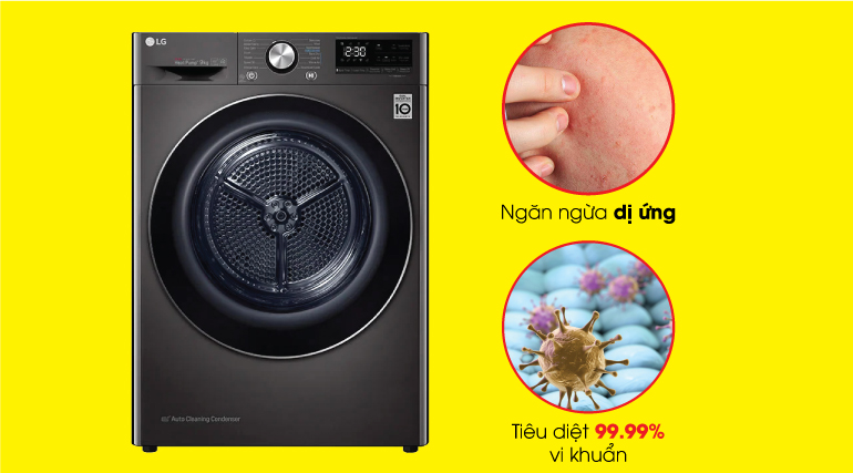 Máy sấy quần áo LG này sử dụng công nghệ Allergy Care có khả năng ngăn chặn dị ứng, tiêu diệt 99.99% vi khuẩn và nấm mốc, giúp bảo vệ sức khỏe toàn diện cho cả gia đình