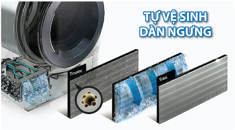 Dàn ngưng có thể tự động làm sạch sau mỗi lần sử dụng giúp cho bạn và gia đình giảm thêm chi phí bảo dưỡng. Dàn ngưng có thể tự làm sạch ở nhiều mức độ khác nhau phụ thuộc vào môi trường, tần suất hoạt động có thể khác nhau tùy thuộc vào khối lượng và độ ẩm của quần áo