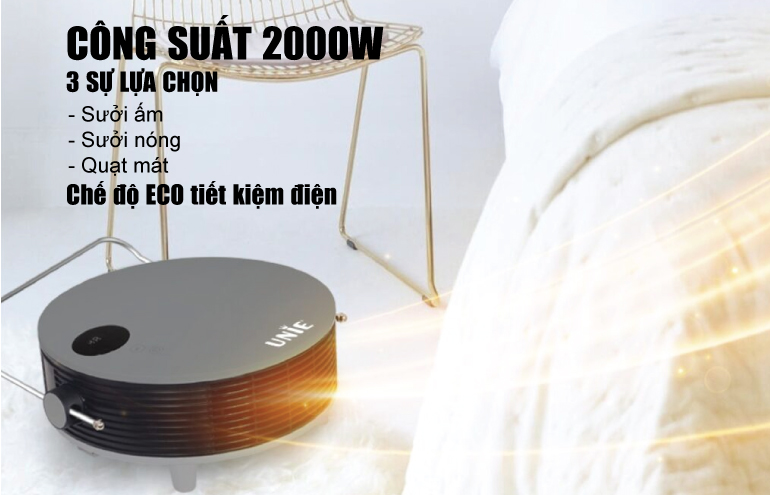 Công suất lớn 2000W sử dụng phù hợp cho không gian rộng từ 15-25m2 với 3 sự lựa chọn cho nhu cầu sử dụng như sưởi ấm, sưởi nóng và quạt mát sử dụng vào mùa hè. Nhờ có chế độ ECO tích hợp sẵn trong máy mà máy sưởi gốm Unie có khả năng tiết kiệm điện đến 30% so với máy sưởi gốm không có ECO