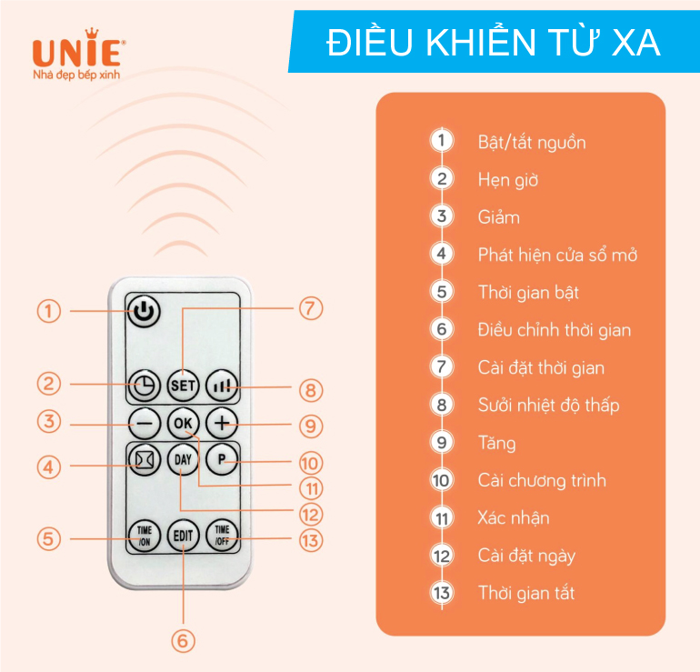 - TIME ON/ TIME OFF: Cài đặt thời gian bật/ tắt máy sưởi
