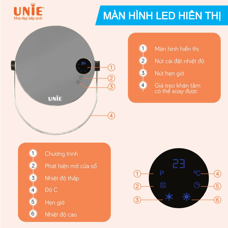 - Màn hình LED hiển thị thời gian, nhiệt độ và chế độ cảnh báo cửa sổ mở rõ ràng