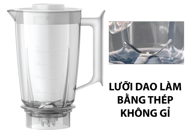 Lưỡi dao của máy xay sinh tố này được làm từ chất liệu thép không gỉ, sắc bén, độ bền cao nâng cao thời gian sử dụng. Ngoài ra, lưỡi dao được thiết kế 4 cánh cho hiệu quả xay nhuyễn, mịn thực phẩm nhanh chóng gấp 3 lần.