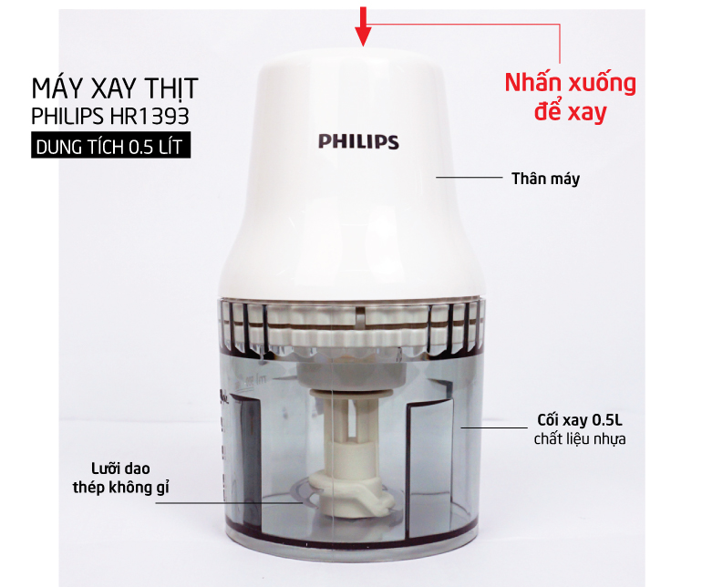 Máy xay thịt Philips được làm từ chất liệu nhựa cao cấp, có độ bền cao, dung tích 0.5L, thiết kế đơn giản và gọn nhẹ, thuận tiện cho việc cất giữ. Ngoài chức năng chính là xay thịt thì sản phẩm có thể xay được cả Hành, tỏi, ớt, đồ khô, rau, củ, quả.....