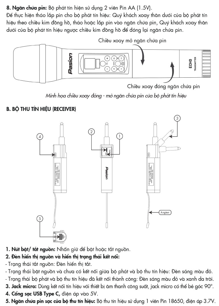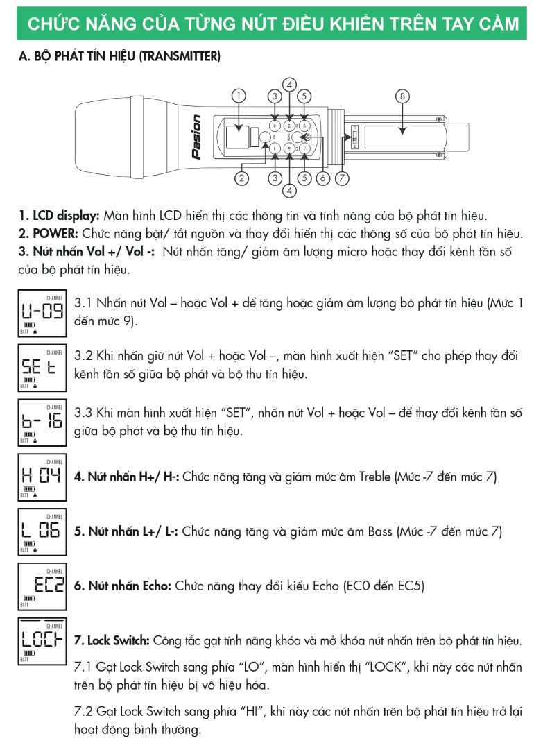 PASION ECHO là micro không dây tích hợp công nghệ xử lý quy trình số (DSP), cho phép người dùng thao tác hiệu quả các chức năng điều chỉnh Echo, Bass, Treble, Volume trực tiếp trên thân micro.