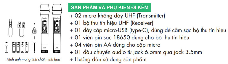 Bộ thu tín hiệu (Receiver) sử dụng pin sạc 18650-1200mAh với cổng sạc Type C. Ngõ ra tín hiệu (Jack micro) của bộ thu được thiết kế với jack 6.5mm có thể gập gọn 90°, đồng thời trang bị thêm 1 đầu chuyển audio qua jack 3.5mm.