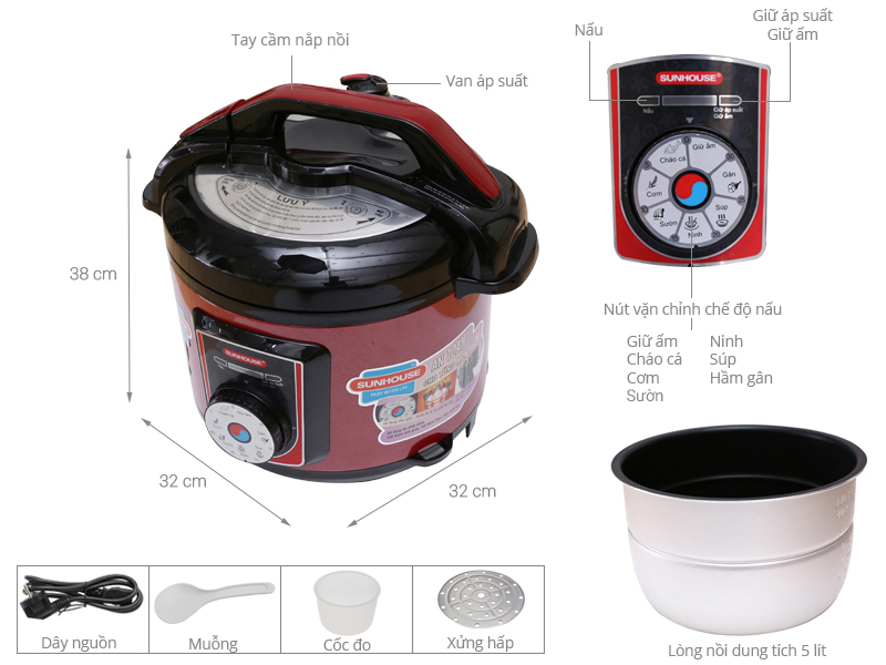 Nồi áp suất điện đa năng SHD1755 có công suất 1000W cho bạn thỏa sức chế biến các món ăn đã được cài đặt sẵn như: Cháo cá, gân, súp, ninh, sườn, cơm và giữ ấm. Nồi áp suất với dung tích 6 lít cho bạn sử dụng trong gia đình có từ 6 thành viên trở xuống