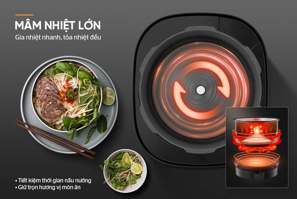 Mâm nhiệt lớn: Mâm nhiệt lớn giúp gia nhiệt nhanh và tỏa nhiệt đều, đảm bảo thực phẩm chín đều, giữ trọn hương vị và dinh dưỡng.