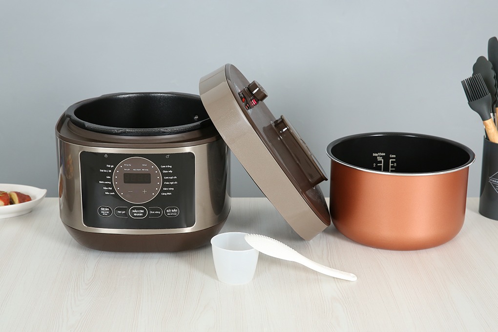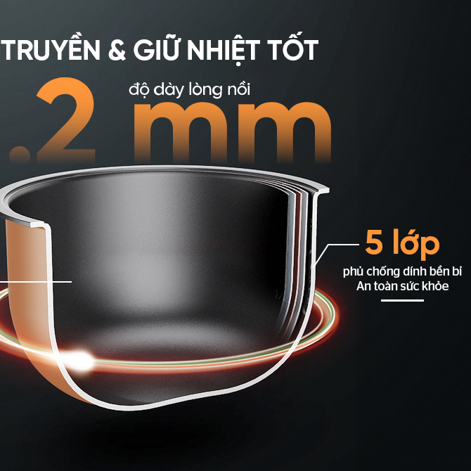 Lòng nồi hợp kim nhôm 5 lớp phủ chống dính cao cấp: Lòng nồi được làm từ hợp kim nhôm với 5 lớp phủ chống dính cao cấp, giúp nồi bền bỉ, chống bám dính thức ăn, dễ dàng vệ sinh và đảm bảo an toàn sức khỏe cho người sử dụng.