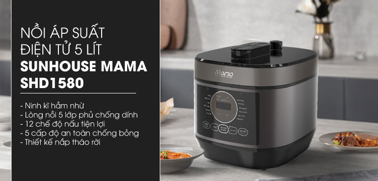 Nồi áp suất điện tử Sunhouse Mama SHD1580 là sự lựa chọn hoàn hảo cho những gia đình hiện đại, mong muốn tiết kiệm thời gian nấu nướng mà vẫn đảm bảo chất lượng món ăn. Với dung tích 5 lít, sản phẩm này đáp ứng tốt nhu cầu của gia đình từ 4 đến 6 người.