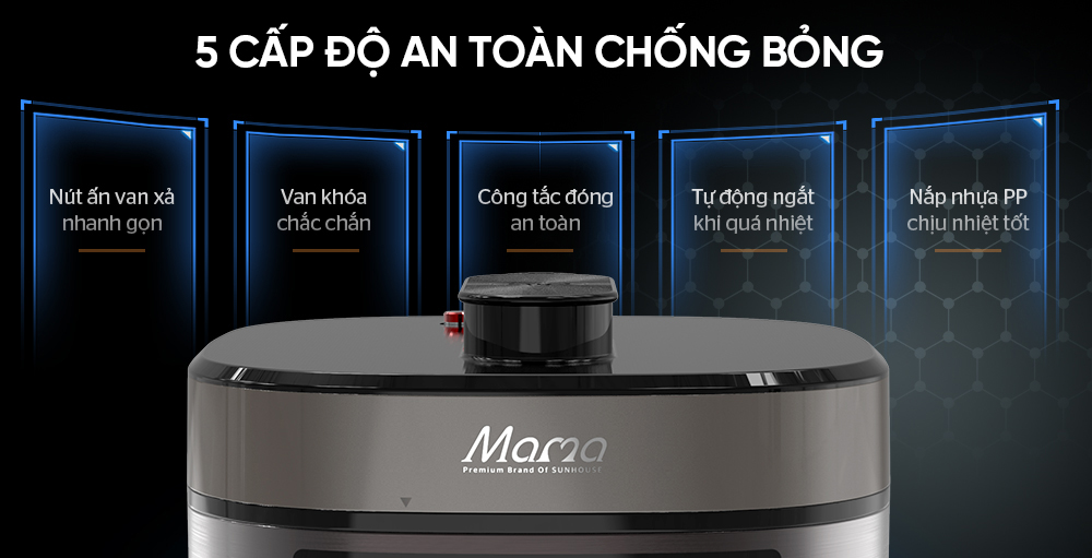 Thiết kế an toàn: Nồi được tích hợp các tính năng an toàn như van xả áp tự động, khóa nắp khi có áp suất, giúp bảo vệ người dùng trong quá trình sử dụng.