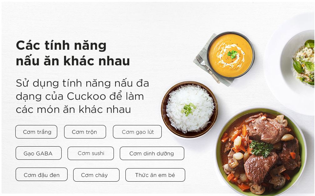 Nồi có nhiều chức năng nấu được cài sẵn, dùng để nấu cơm, cơm trộn, cơm gạo nứt, gạo Gaba, cơm Sushi, cơm dinh dưỡng, cơm đậu đen, cơm cháy, nấu cháo, thức ăn cho bé giúp các mẹ không cần đau đầu vì lựa thực đơn mỗi ngày.