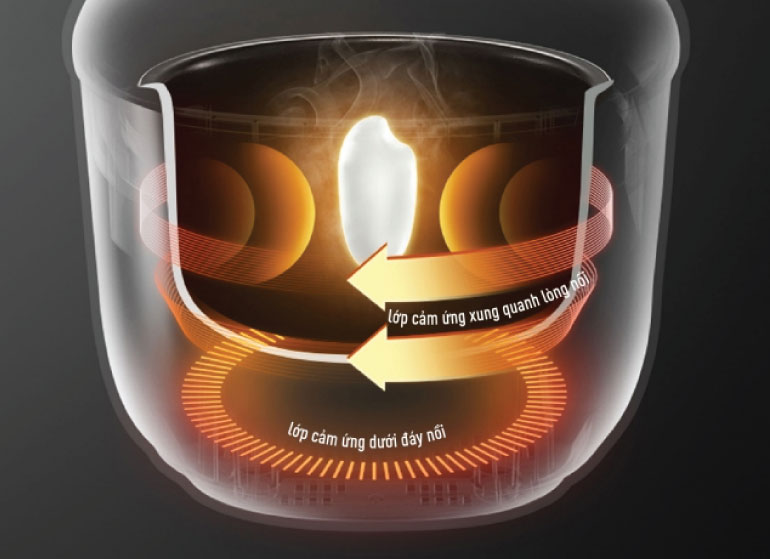 Cảm ứng từ hai lớp dẫn nhiệt 3D để phân bổ đều nhiệt bao quanh ruột nồi giúp cơm chín kỹ từ trong ra ngoài.