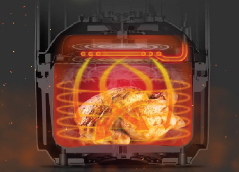 Công nghệ Rapid Air giúp nhiệt truyền với cường độ lớn phủ khắp bề mặt thực phẩm và xuyên thấu vào bên trong làm cho thực phẩm luôn chín đều và giòn tan. Nhiệt độ được tập trung tối ưu không bị thoát ra ngoài tạo lớp vỏ giòn vàng cho món ăn đẹp mắt bên ngoài, mềm bên trong.