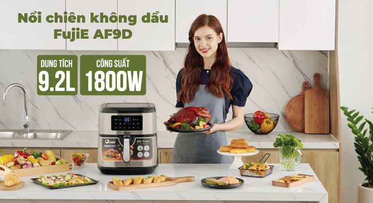 Nồi chiên không dầu FujiE AF9D có công suất lớn 1800W, dung tích 9.2L , giúp chiên, nướng.. chín thức ăn đều và nhanh chóng giúp tiết kiệm thời gian. Thực phẩm chín đều nhanh chóng nhờ nhiệt độ cáo đến 200 độ.
