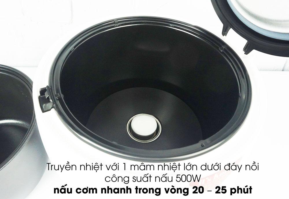 Sản phẩm có thiết kế tay cầm phía trên bằng nhựa tổng hợp không gây nóng và được gài chặt với phần thân nồi có thể nhấc lên hay di chuyển dễ dàng và an toàn. Nồi cơm điện được hoạt động mạnh mẽ với công suất 500W, giúp bạn nấu cơm nhanh chín, hạt cơm nở đều tơi xốp thơm ngon. Khi cơm chín, nồi tự động chuyển sang chế độ hâm tự động, vừa tiện lợi vừa giúp tiết kiệm điện đáng kể.