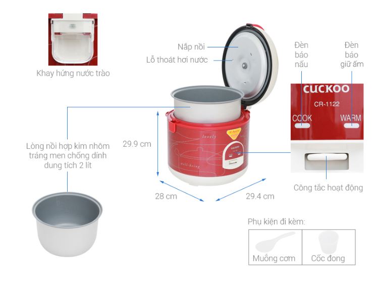 Bạn có thể nhận diện tình trạng thức ăn đang nấu bằng đèn báo được hiển thị rõ trên thân nồi. Ngoài ra, nồi cơm nắp gài Cuckoo CR-1122 còn kèm theo cốc nước đo gạo và hộp gài muỗng để bạn dễ dàng thao tác. Dây điện dài tới 120cm, có thể quấn gọn với lõi nằm dưới mặt thân nồi tiện lợi. Giờ đây chỉ cần nhấn cần gạt là bạn đã có bữa cơm đậm đà, ấm cúng.