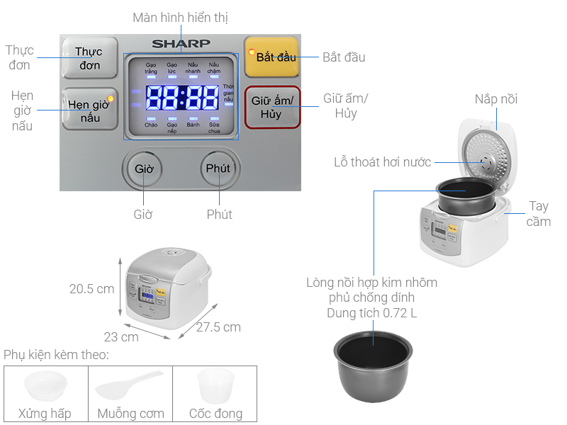 | 9 chức năng | Sữa chua, Nấu nhanh, Nấu chậm, Làm bánh, Gạo trắng, Gạo nếp, Gạo lứt, Giữ ấm, Cháo |