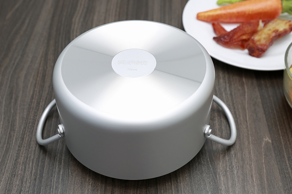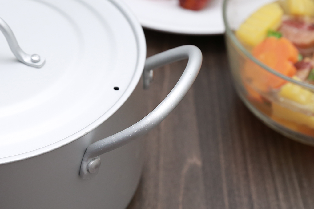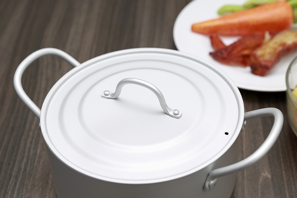 Tay cầm dạng đũa dễ cầm nắm, nắp nhôm dày giữ nhiệt tốt giúp nấu ăn nhanh hơn.