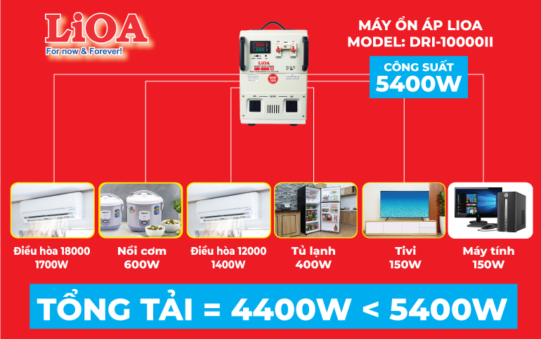 Ví dụ như máy ổn áp này có công suất là 10KVA = 5400W sẽ sử dụng được cho máy điều hòa 18.000BTU (1700W), Tủ lạnh 400W, điều hòa 12000BTU (1400W), nồi cơm điện 600W, máy tính 150W, TIVI 150W (Tổng tải = 4400W < 5400W)
