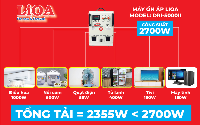 Ví dụ như máy ổn áp này có công suất là 5KVA = 2700W sẽ sử dụng được cho máy điều hòa 9000BTU (1000W), Tủ lạnh 400W, quạt 55W, nồi cơm điện 600W, máy tính 150W, TIVI 150W (Tổng tải = 2355W < 2700W)