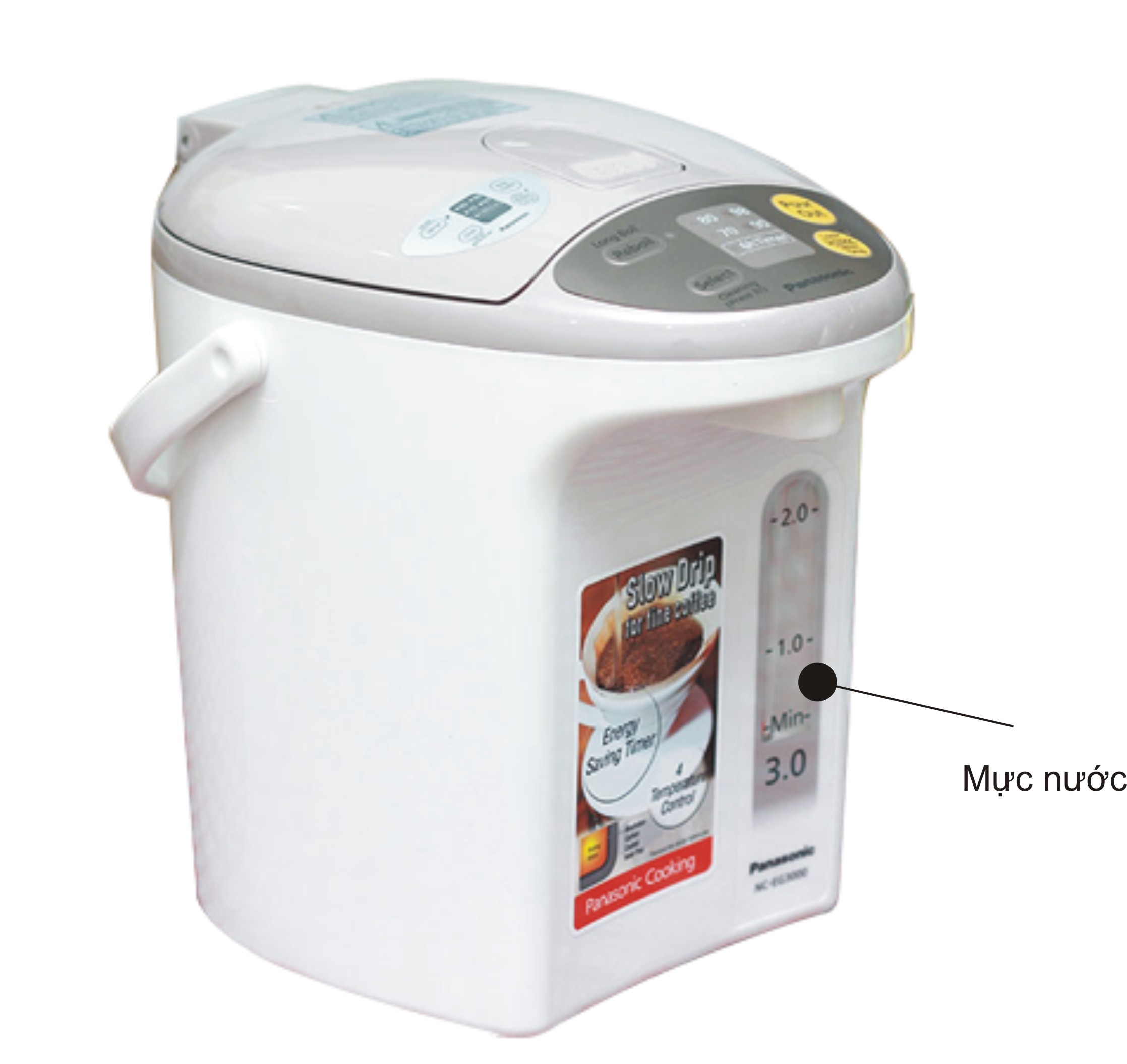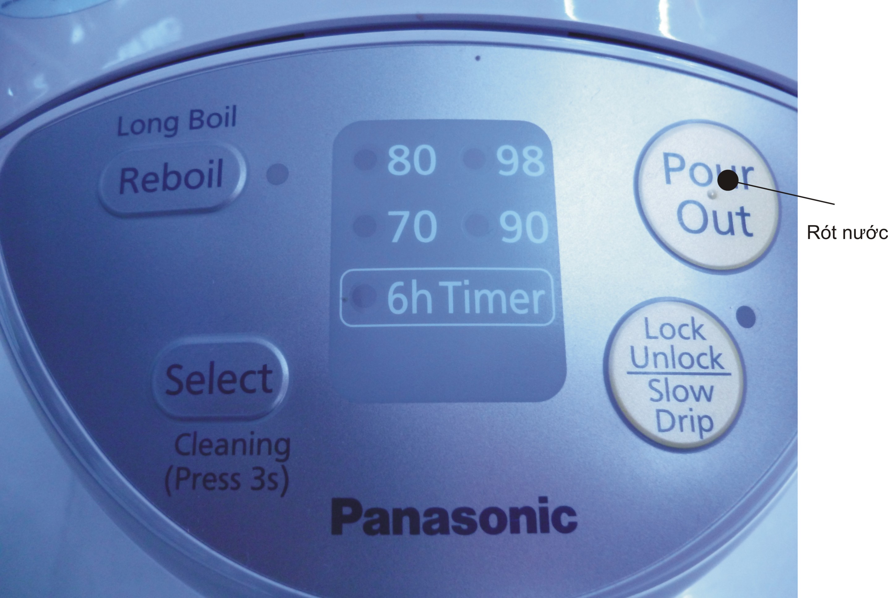 Bình thủy điện Panasonic NC-EG3000CSY trang bị nút rót nước trên bảng điều khiển. Chỉ cần nhấn nút, nước sẽ chảy ra vòi, đảm bảo an toàn cho người sử dụng, không lo bỏng.