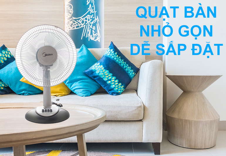 Quạt Midea FT30-Y8BA với kích thước nhỏ gọn, thiết kế xinh xắn với tông màu xám trắng. Quạt phù hợp để trên bàn hoặc trên giường thậm chí là gầm bàn phục vụ nhu cầu làm mát cho cá nhân.