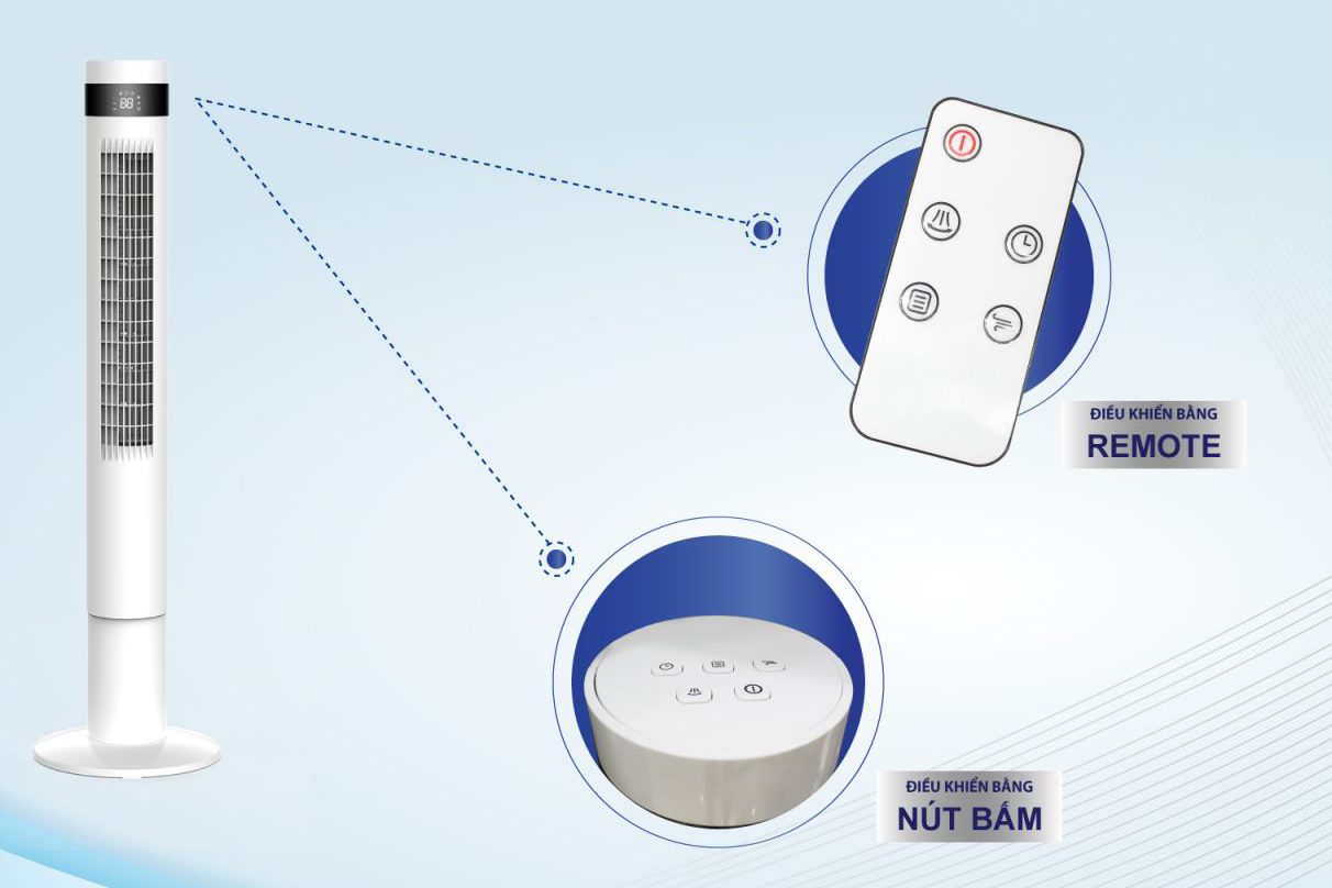 Bạn có thể điều khiển bằng phím bấm trực tiếp trên quạt, hoặc có thể điều khiển quạt từ xa với remote đi kèm.