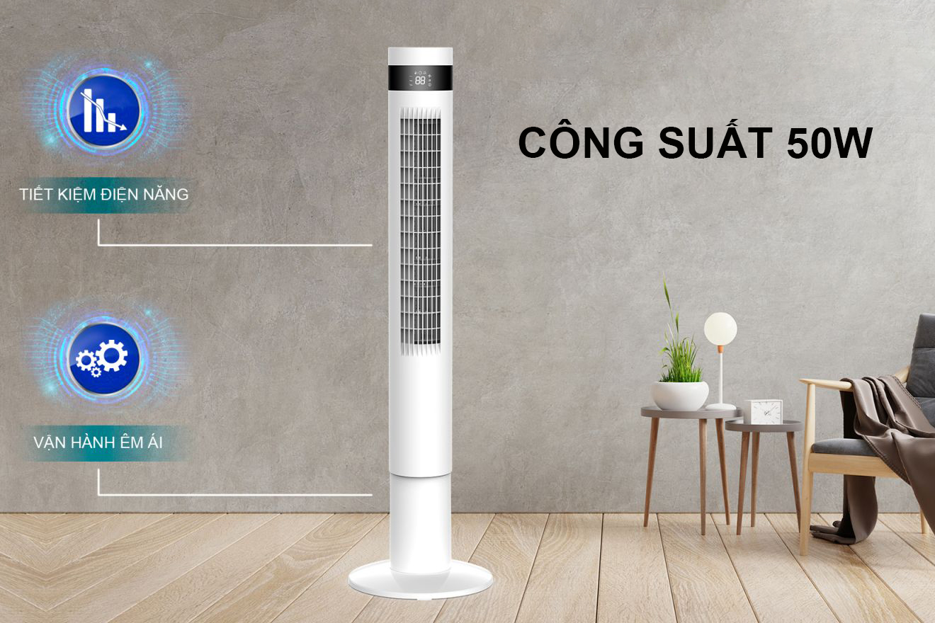 Quạt tháp có công suất 50W, chính vì thế bạn có thể sử dụng quạt cả ngày mà không ngại chi phí tiền điện. Tiết kiệm chi phí tuyệt đối cho gia đình bạn