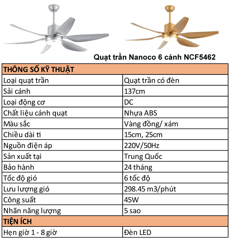 Thông tin: Quạt trần Nanoco 6 cánh NCF5462-GL/SL, có đèn, có khiển