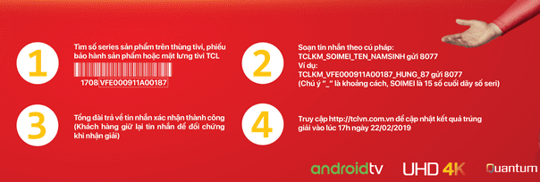 - Sau khi nhận được tin nhắn thông báo trúng thưởng từ Công ty Điện và Điện Tử TCL (Việt Nam), khách hàng liên hệ theo thông tin của tin nhắn để nhận hướng dẫn về việc nhận thưởng (từ 22/02/2019 đến 17h ngày 05/03/2019).