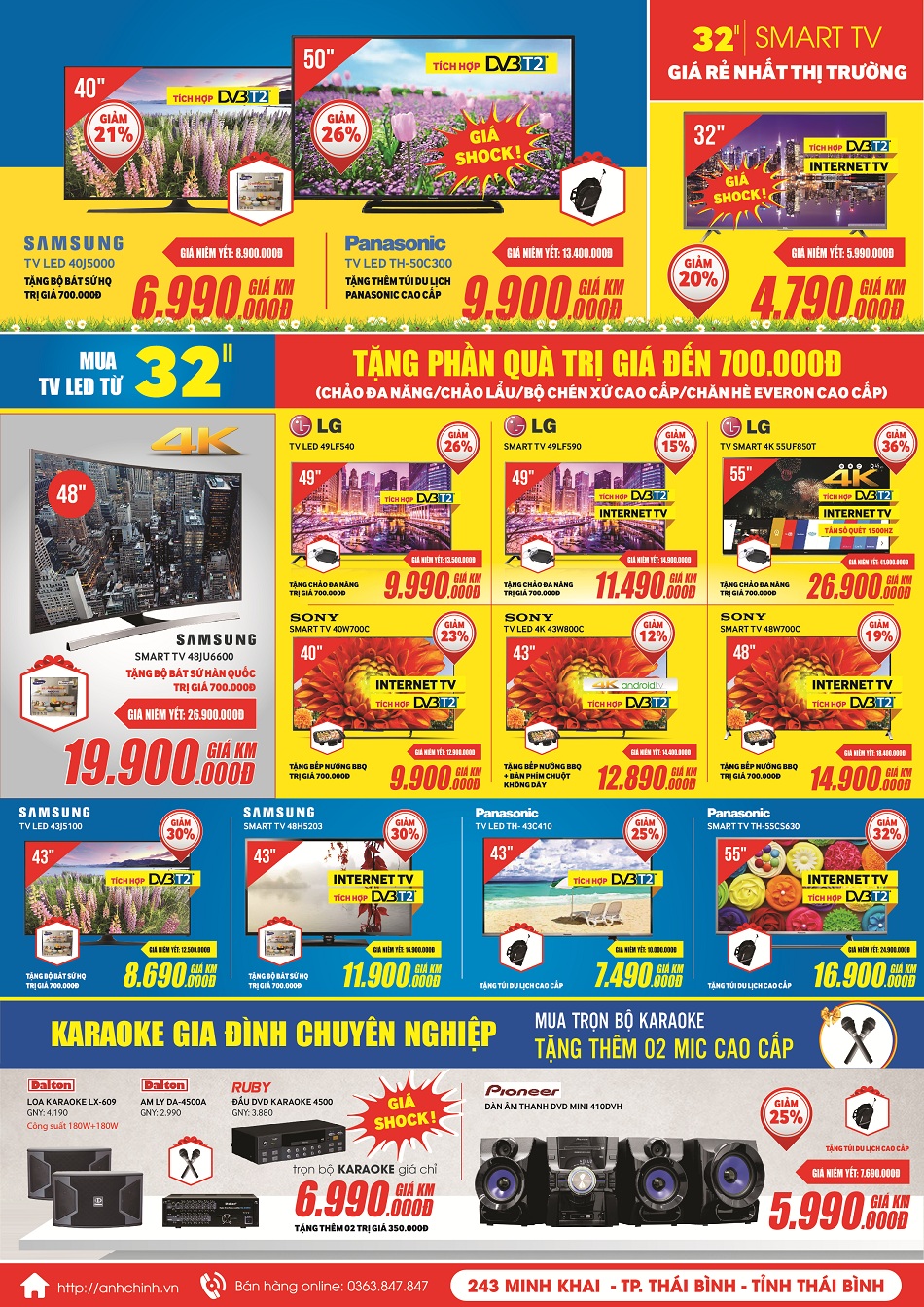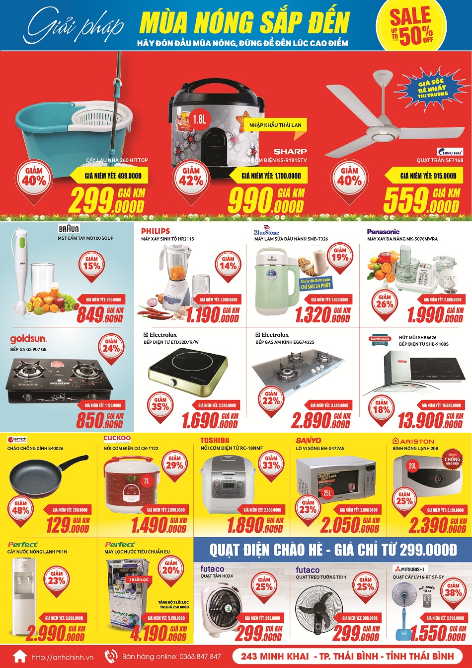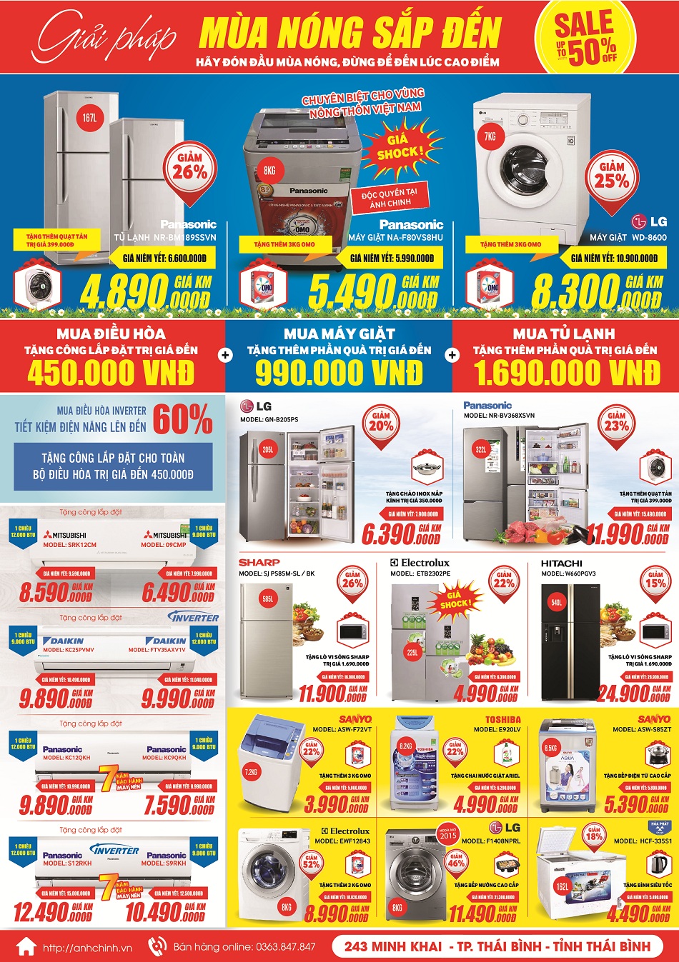 Hưởng ứng chương trình hành động vì quyền lợi của người tiêu dùng. Ánh Chinh hân hạnh mang đến quý khách chương trình khuyến mại chào hè. Giảm giá đến 50%. Mua ti vi size lớn giá nhỏ. Cơ hội mua điêu hòa giá tốt nhât trong năm với chất lượng dịch vụ tốt nhất