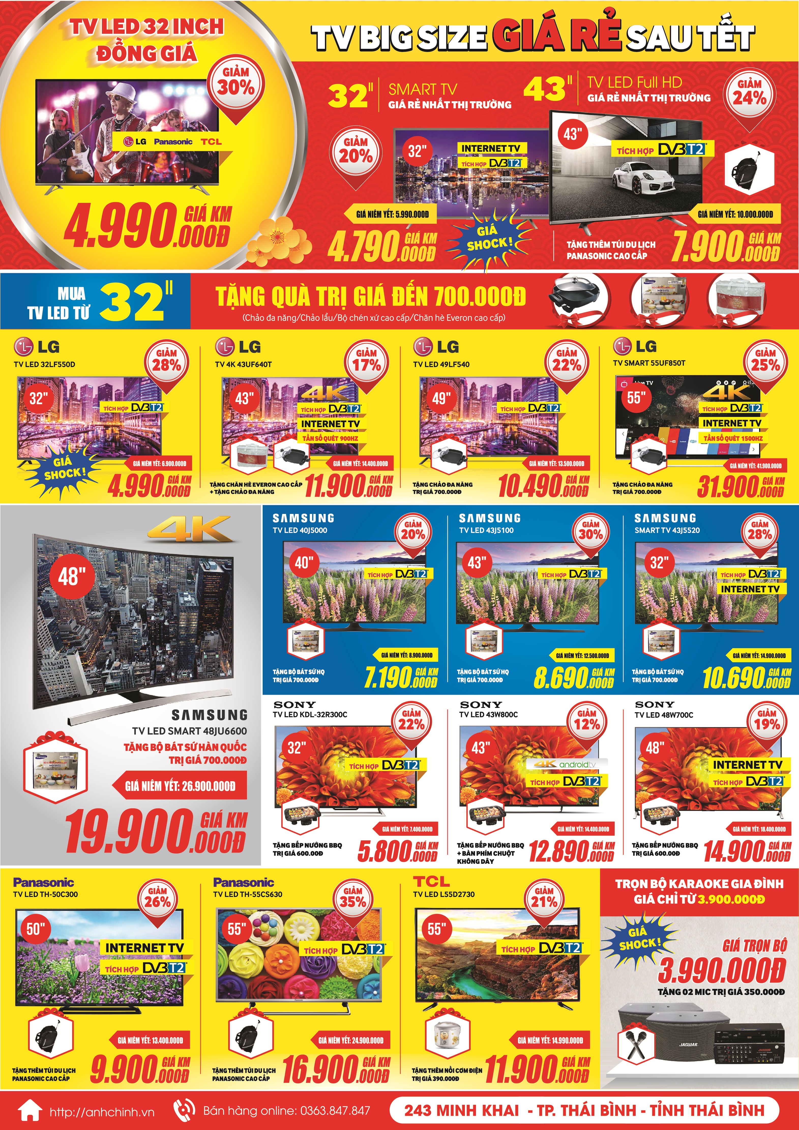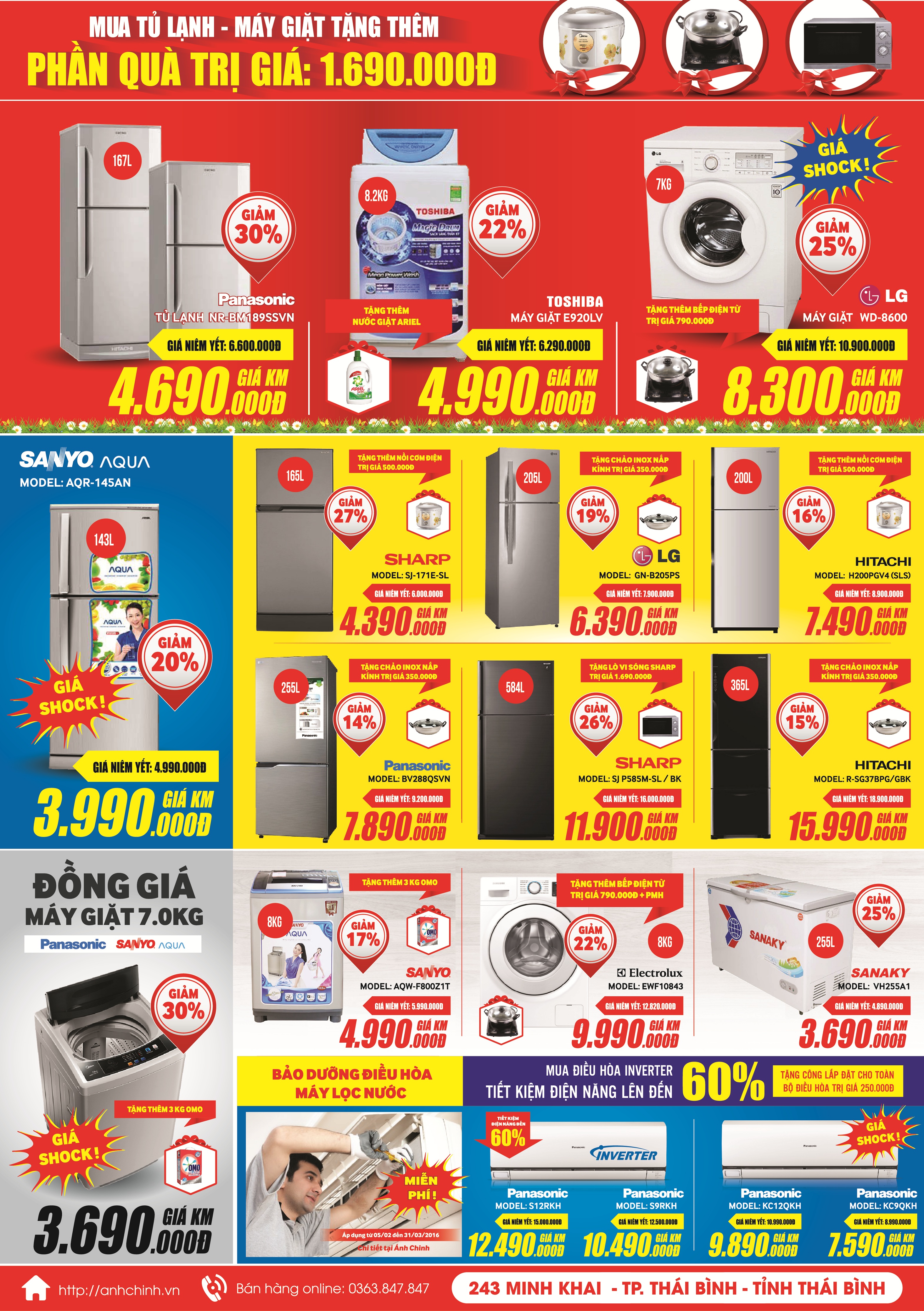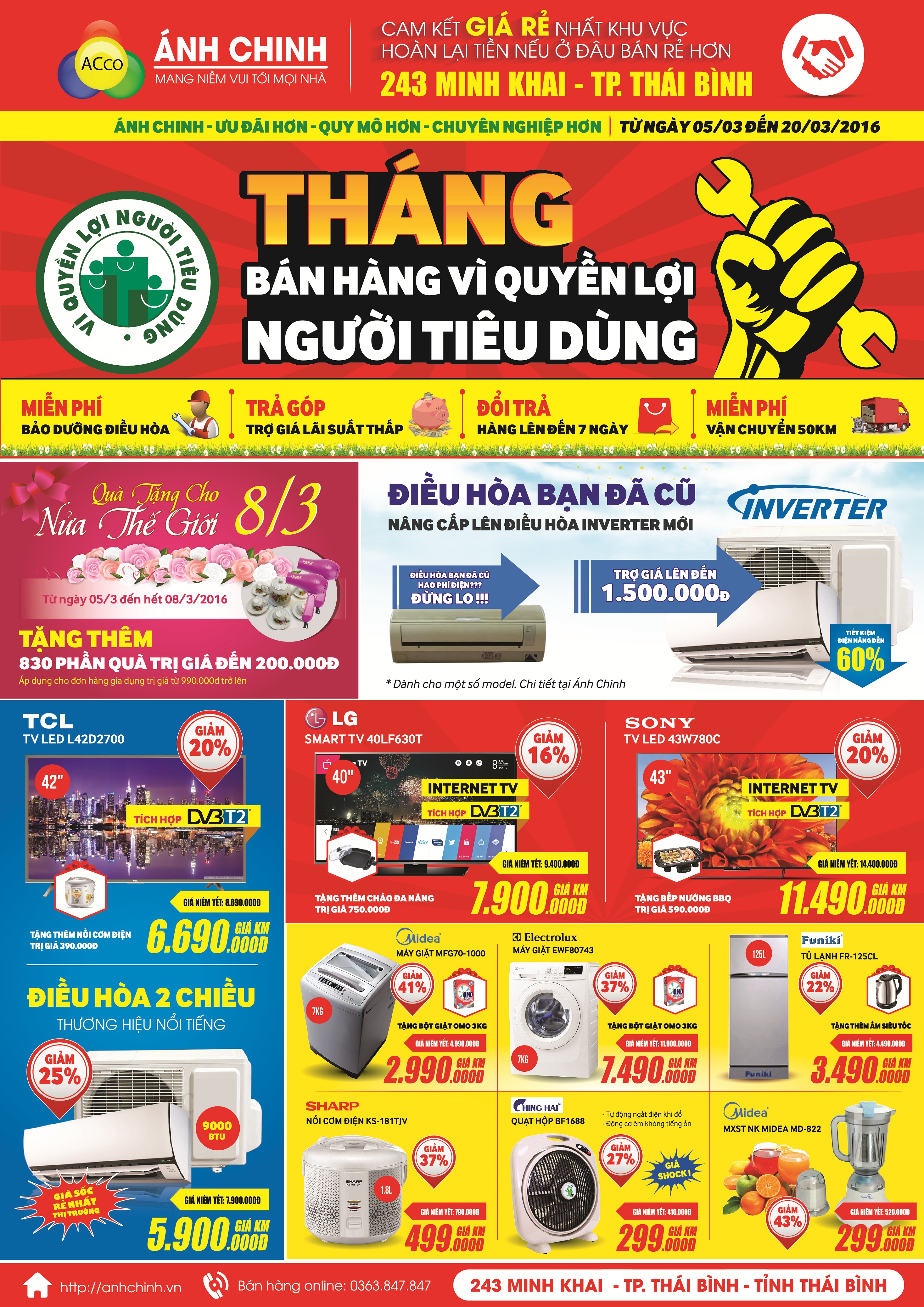 Hưởng ứng chương trình hành động vì quyền lợi của người tiêu dùng. Ánh Chinh hân hạnh mang đến quý khách chương trình khuyến mại giá rẻ sau tết. Giảm giá đến 50%. Mua ti vi size lớn giá nhỏ. Cơ hội mua điêu hòa giá tốt nhât trong năm với chất lượng dịch vụ tốt nhất
