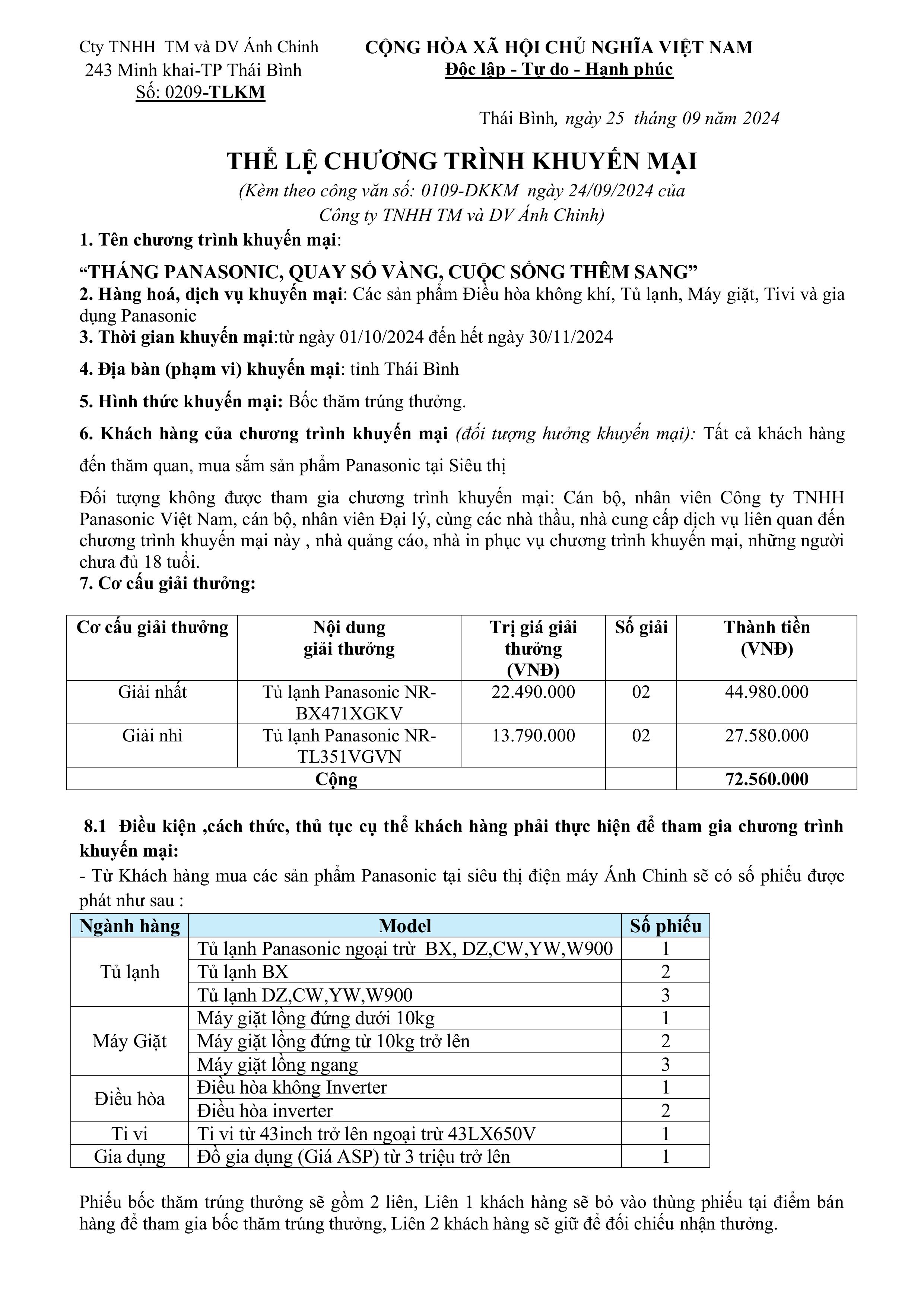 Áp dụng cho khách hàng khi mua sản phẩm Panasonic Tại siêu thị điện máy Ánh Chinh từ 01/10/2024 đến 30/11/2024
