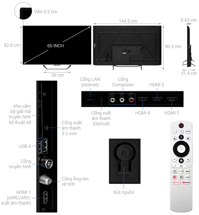 | 1 cổng Composite | 1 cổng 3.5 mm, 1 cổng Optical, 1 cổng eARC (ARC) |