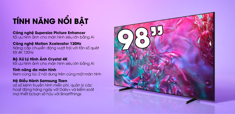 Tivi Samsung 98 inch này sẽ nâng cấp mọi nội dung yêu thích lên đạt chuẩn 4K nhờ bộ xử lý Crystal 4K giúp bạn tận hưởng những thước phim nguyên bản thật như cuộc sống với công nghệ ánh xạ màu tiên tiến.