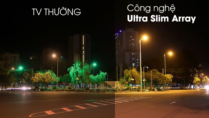 Công nghệ Ultra Slim Array trên tivi Samsung sẽ điều chỉnh ánh sáng đèn nền, cho sắc đen sâu thẳm và sắc trắng sáng rõ hơn, cảnh đêm trên tivi vẫn rõ ràng như ngoài đời thực.