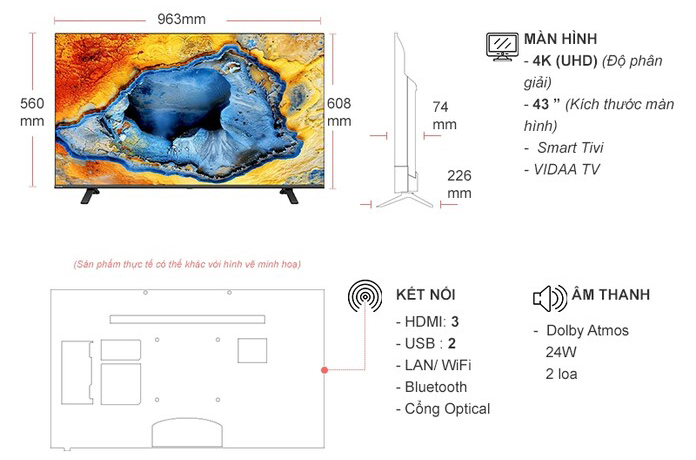 | Cổng nhận hình ảnh, âm thanh | 3 cổng HDMI có 1 cổng HDMI eARC (ARC), 1 cổng Composite |